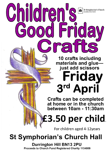 10am Good Firday Children's Craft Morning. All welcome. £3.50 per craftbag containing 10 crafts.